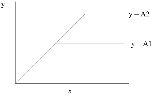 Figure 1. Liebig's Law of the Minimum. The nutrient in the minimum refers to the nutrient in the least relative quantity in the soil. It is the growth limiting nutrient. All other nutrients are in excess. Liebig's Law predicts that when the nutrient in the minimum (X) is added in increasing amounts to a plant correspondingly increasing yields (Y) are obtained untill a second nutrient becomes in the minimum. A plot of the amount of X added vs. Y will be linear untill the second nutrient becomes limiting. At this point the yield curve will be flat as indicated by the horizontal line y = A1 which is the maximum yield possible under the given conditions. According to the law when a second growth limiting nutrient is increased a higher maximum yield is possible as indicated by the line y = A2.