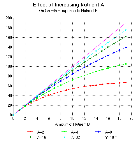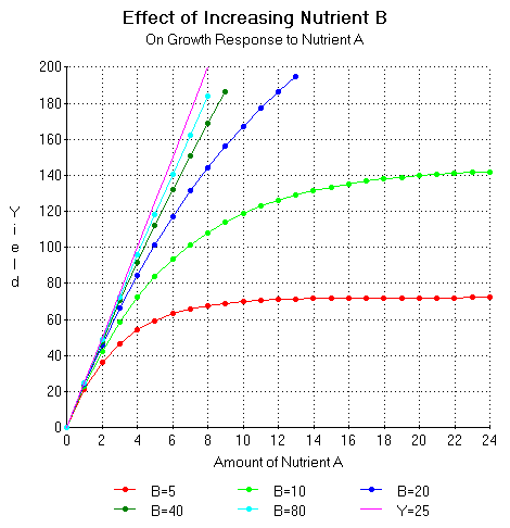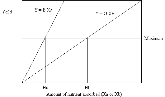 If instead of adding nutrient A we add a nutrient which is used less efficiently (e.g. nutrient B) we will obtain a plot of nutrient B vs. the yield in which the line has a slope which is less steep than for nutrient A. This line can be described by the equation Y = G Xb. Where G is the slope of the line and Xb is the amount of nutrient B.