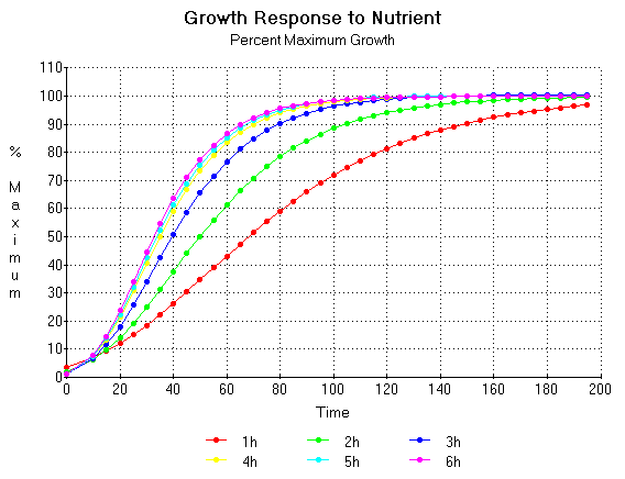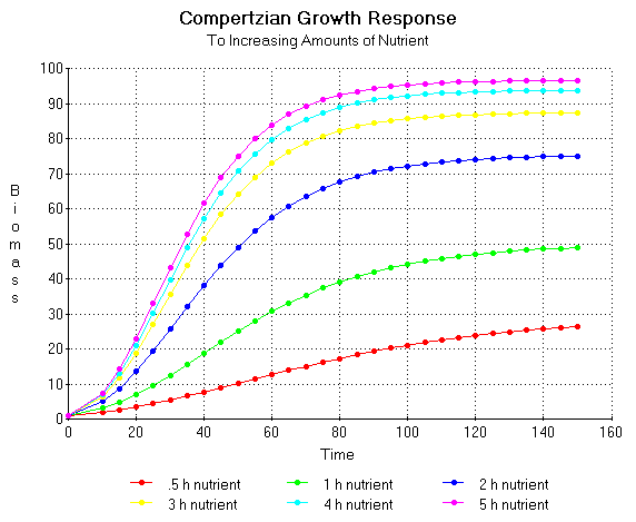 Now if we let h = 5 (the quantity of nutrient required to give a half maximum yield) and we let K' = 100, B' = 5, and A = 100 then from these values we can plot a series of time courses which will allow us to determine the theoretical yields at various times for various amounts of nutrient. From the Mitscherlich equation we know that if we add 2.5 grams of nutrient this amount should yield a maximum weight of 29.3 grams of plant weight, 5 grams should yield 50 grams of plant weight and so on up to 100 grams of biomass. These figures along with the number of effect factors (nh) are given in the following table: