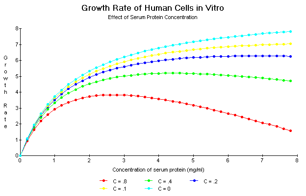 The hyperbolic equation does not adequately express the effect of nutrient concentration on the growth rate of plants in all situations, however. In some cases micronutrients may have toxic effects even at relatively low concentrations. Macronutrients, of course, can cause fertilizer "burn" by drawing out water from the plant causing it to wilt. Human cells grown in high concentrations of unfractionated serum become distorted in appearance and shrink probably for the same reason. In these situations the growth rate equation dD/dt = A [x] / ([x] + B) - C[x]