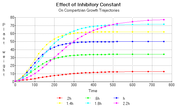 Figure 17. Growth trajectories computed from the same equations as used for figure 12 except with different multiples of the effect factor h and with the m constant computed from the expression m = K/(A [x] / ([x] + B) - C[x]).