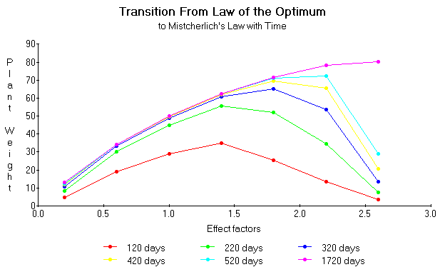 Taking slices at different times from the above graph we can see how the computed use efficiency would change had we taken weight measurements at 120, 220, 320, 420, 520, and 1720 days in figure 17. It can be seen that with time Liebscher's Law of the Optimum becomes the Mitscherlich Law. That is, that the growth increment is proportional to the decrement from the maximum yield.