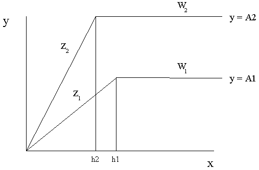 Figure 2. Liebscher's Law of the Optimum predicts an increase in the use efficiency of the nutrient X as a second nutrient W is brought closer to the optimum. The use efficiency of X is determined by finding the slope Z of the line of the minimum (where Z 2> Z 1 ). Y represents the yield. Two different levels of the 2nd nutrient (W1 and W2) are shown. A1 and A2 represent maximum yields for the amounts of the 2nd nutrient W1 and W2 respectively. Thus the use efficiency of nutrient X is dependent on the quantity of nutrient W. In actuality the growth response is curvilinear and the lines with the slopes Z 2 and Z 1 represent oblique asymptotes while the lines W2 and W1 represent horizontal asymptotes. The values h1 and h2 represent the amounts of nutrient X which are required to produce a half maximal growth response to X at the levels of W1 and W2 respectively.