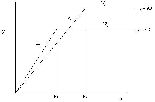 As we can see from these graphs as the use efficiency of X (represented by the slope Z) is increased from Z1 to Z2 by increasing nutrient W from W1 to W2. The value of h initially decreases from h1 to h2 but as the amount of W is increased above the optimum the use efficiency decreases from Z2 to Z3 and the value of h increases from h2 to h3.