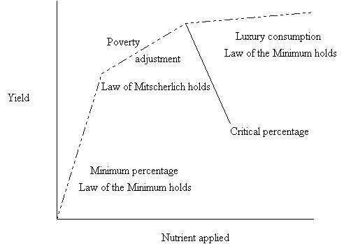 Macy suggested that the Law of the Minimum was valid in the zone of minimum percentage and in the zone of luxury consumption while Mitscherlich's law was valid in the zone of poverty adjustment. Macy's nutritional zones with respect to the yield curve are shown in figure 5.