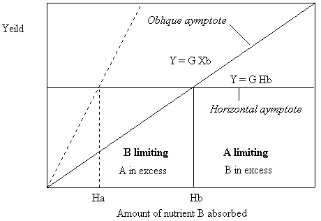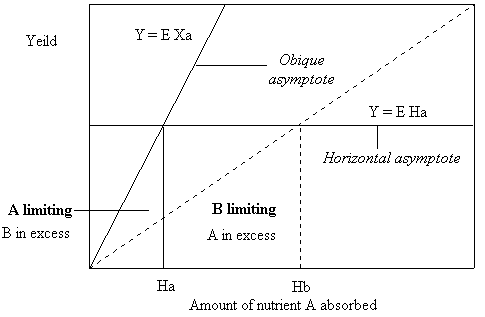 In the first case a plot which of the growth response of a plant to increasing amounts of nutrient A will have an oblique asymptote equal to Y = E A and a horizontal asymptote of Y = G Ha. In the second case, a plot which of the growth response of a plant to increasing amounts of nutrient B should have an oblique asymptote equal to Y = G B and a horizontal asymptote of Y = G Hb. Now, since Y = EHa = GHb we can derive the equations: