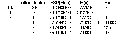 Table 1 shows a comparison between the Logarithmic equation of Mitscherlich and the hyperbolic equation of Rauterberg showing the relationship between the number of "effect quantities" added and the predicted fraction of the maximal yield obtainable by adding the given number of effect quantities. The effect quantity (nh) is a multiple of the amount of nutrient required to give a half maximal yield)